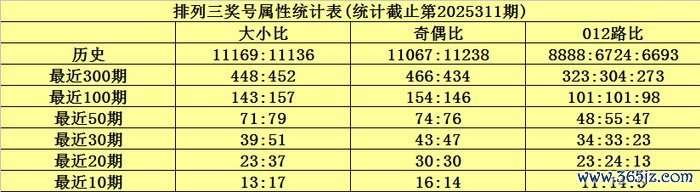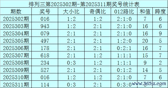 上期回来:陈列三第2025311期奖号为114,奖号012路比为0:3:0,奇偶比为2:1,大小比为0:3,和值为6,跨度为3。